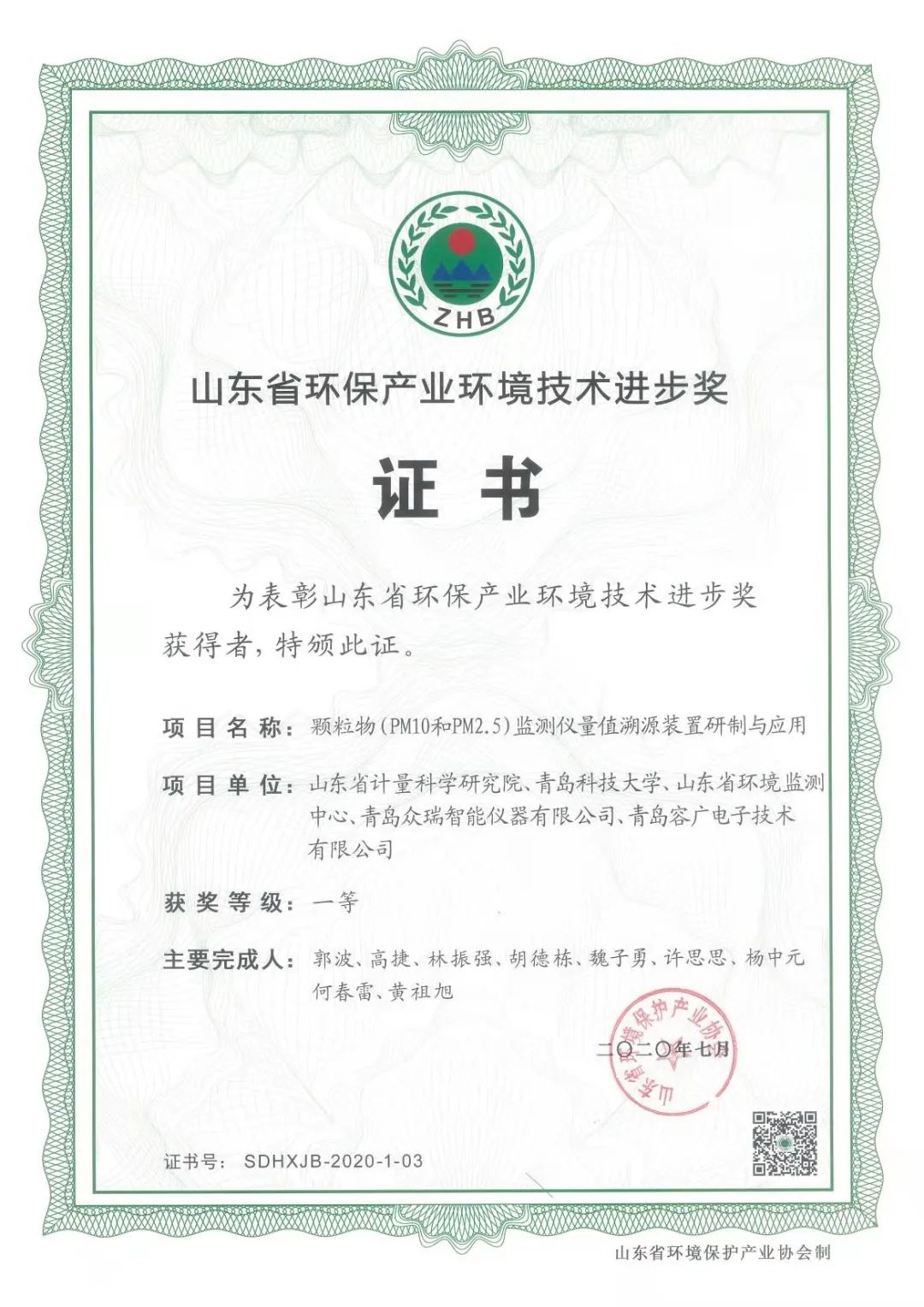 荣获“2020年度山东省环保产业环境技术进步奖”