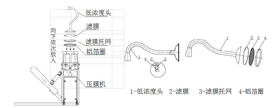 将铝箔圈、滤膜托网、滤膜(毛面朝上)、低浓度头依次放入压膜机上端,按下压膜机把手轻轻一按即可成型。使低浓度头、滤膜、滤膜托网、铝箔圈紧密结合,如下图所示。